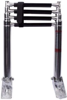 Engineered for marine use, this boat ladder bolts onto either a boat floor or side railings. Each of the ladder segments glides smoothly and carries nylon bushings to prevent unwanted deployment. It is easy to board due to the convenient vinyl surfaces on its rungs and its angled positioning. When not in use, the velcro belt buckle fastens securely around the retracted rungs and keeps it set in place.
