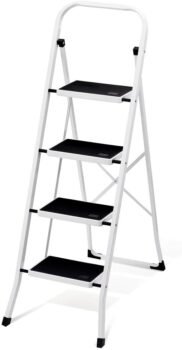 If you need to access something just slightly out of reach, this three-step ladder will do the job. Its sturdy frame boasts high-grade steel construction capable of supporting up to 500 pounds, and it provides the stability you need. It has multiple safety features, such as a metal buckle that automatically locks into position and non-slip platforms with an additional brace underneath for reinforced support. As a bonus, it folds easily for compact storage.