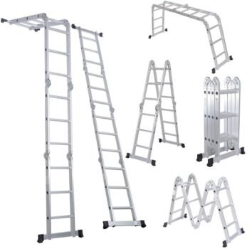 This dynamic aluminum ladder by Luisladders folds and locks into a variety of heights and shapes. It uses multiple locking hinges and levers that do not require much manual effort, so it is easy for anyone to operate. Its durable construction offers a load capacity of up to 330 pounds, and it’s certified for commercial use. It has slip-resistant square rungs and non-slip, rubber-angled feet that carry undulating ridges for extra stability.