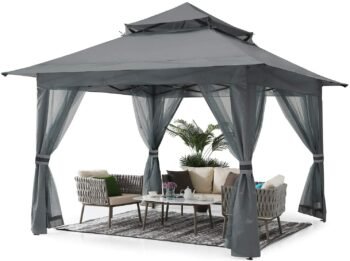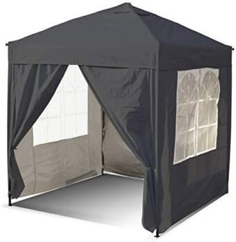 The sturdiness provided by this gazebo helps it remain mounted on the ground, even when winds pick up. The gazebo comes with weights to keep the tent down. A portable solution that gives you sufficient space for small gathers on the inside. In addition to the 2×2 gazebo, these pop-up canopy tents also come in a larger size. You can choose between four colour options, including blue, grey, white, and green. The gazebo has a multifunctional design, with panels that can be customised according to your own needs. The frame itself is made from durable steel materials, which further adds to the sturdiness the tent is able to offer.