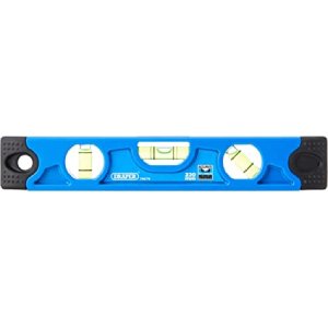The Draper 79579 spirit level has a magnetic base, enabling you to position it on a metal pipe or set of studs unaided. There are three vials included for measuring at an angle, vertically or horizontally, depending on the nature of your project. Each vial has a sensitivity of 0.1 degrees, and the tool has a level accuracy of 1.75mm/m = 0.57 degrees in its standard position.